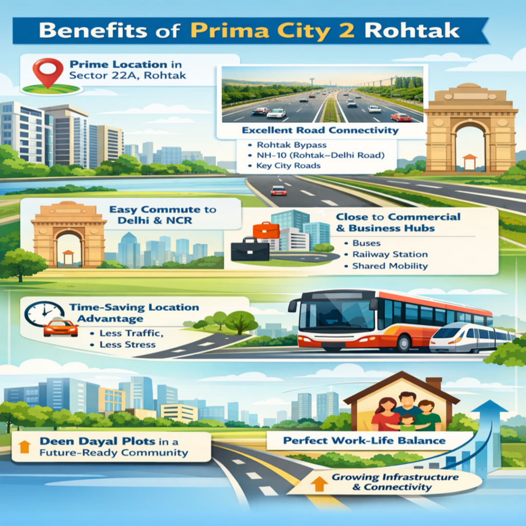 Prima City, Sector 22A, Rohtak stands out as a commuter-friendly residential destination, especially for those investing in Deen Dayal plots, due to its strategic location, strong road connectivity, and proximity to key destinations. Whether you commute daily within Rohtak or travel towards Delhi and nearby regions, Deen Dayal plots at Prima City offer the right balance of accessibility, comfort, and future-ready living.